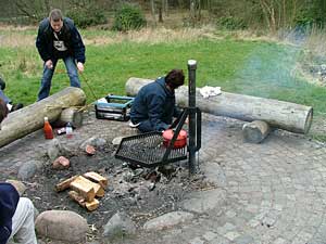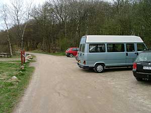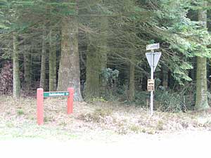 6 km fra campingpladsen når man til en ny rundkørsel. Vælg vejen mod Fousing og fortsæt mod Linde, et skilt "Klosterhedens skovdistrikt" viser frakørslen fra rute 509 lige før en rundkørsel. Se billederne herunder.