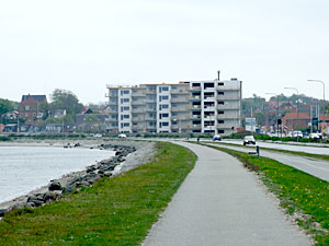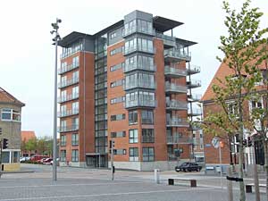 Strandparkens bygninger er aldeles iøjnefaldende. Men se lige engang til venstre og nyd synet af Sejlhusende, som er vist herunder. |