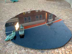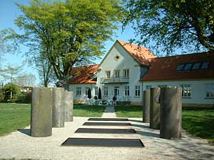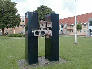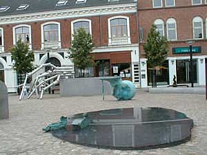 Vel ankommet til stationspladsen går vi nu op af Jyllandsgade for at se et kunstværk af den meget omtalte installationskunstner Ingvar Cronhammar. Kan man ikke komme på hvem denne kunstner er, så tænk på hans store installation ved Herning kunstmuseum "Elia". En metalkugle, der som en anden ufo er styret ned og halvt begravet i jorden med 4 metalsøjler der venter på kontakt fra rummet og vil kunne opfange et lynnedslag og forvandle det til en gigantisk rungen i sit indre. På trods af sine enorme dimensioner står installationen mærkelig udominerende i landskabet, og man stemmes til ro og eftertanke, når man møder dens mærkelige kraft. |