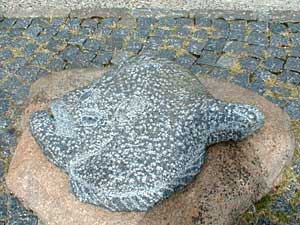 Vi går videre ind i gågaden (Østergade) og kommer forbi en spøjs funktionel stenskulptur ved Profil Optik på Østergade 6 Skulpturen med et hundehoved tjener også som fortøjningsplads for hunde, idet den har en krog hundesnoren på maven. |