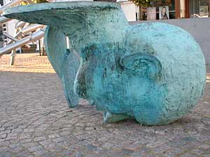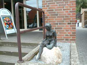 Vi vender om og går tilbage til lyskrydset. Svinger til højre op af Bredgade og lige efter hjørnet af musikskolen går vi ind. Her er der opstillet 2 dejlige skulpturer. Musikkens Portal 2000" af Hans Feldthaus |
