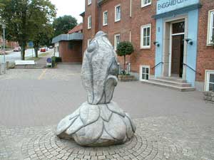 op i byen. I et kig gennem viadukten fornemmer man straks en spændende by. Straks man kommer igennem viadukten støder man på den ene ende af byens gågade (Østergade) og et blik op af gaden antyder, at her kan man vist gøre en god handel.... og det kan man så sandelig! Men vent med at tage gågaden, tag i stedet en tur til venstre op mod jernbanestationen. Stenskulpturen "Søstjernen" kan ses uden for hjørneejendommen Østergade 26 |