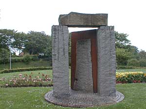 Herefter går vi videre op af Bredgade og svinger til højre op imod Struer Kirke af Kirkebakken, tager trappen helt op til kirken hvor der er opstillet "Skabelsens Port -Lyset og mørket-" Af Henrik Voldmester 1991 |