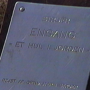 ..... og med rystende hænder spoles båndet frem til scenen. OG PLUDSELIG FREMKOMMER ET SKILT MED DEN OPRINDELIGE INSKRIPTION. "ENGANG" "-ET HUL I JORDEN" Her er så den ægte vare fra den happening, der skabte Struers sjoveste koncept kunstværk!!! Nå, men nu er kunstværket fjernet og det er egentlig en skam |