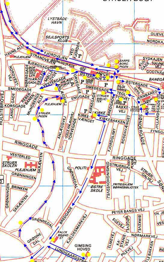 Forbi gymnasiet drejer vi ned af Danmarksgade, svinger igen til højre af Søndergade og kommer nu til: |