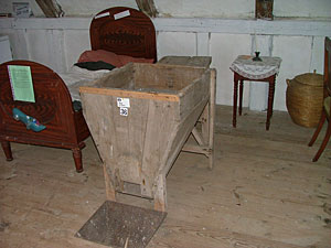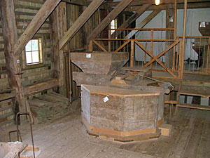 25 pund = 12,5 kilo = 1 skæppeSækkevogn blev brugt når sække med korn blev kørt fra lagerrummet til møllen. Til højre er der en "harrestol", som blev brugt når mølleren skulle skærpe leen. Melsigte. Det fine brødmel blev taget ud fra højre og affaldsproduktet kom ud i bunden til højre. Fra et skod til venstre kunne usigtet mel tages ud. Drev til valsen, som blev trukket direkte fra stjernehjulet. Her valsede man havre til hestefoder.
