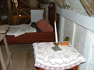 Træskoerne foran sengen har en speciel historie fra stormfloden, idet møllerkonen en morgen vågnede ved at det bankede mod sengen en kold januarnat. Det var træskoerene, som flød i det oversvømmede værelse og som vækkede hende.Den store lodrette aksel kaldes for vællen. Det store stjernehjul øverst på vællen fungerer som en slags kraftudtag. Kværnen til højre består af "kuben", "stolen", "rysteren", "støvkarret" og 2 møllesten (kværnestenene). Kun den øverste sten drejer rundt. Kornet blev hældt i "kuben" øverst på kværnen. Kube til "triøre", som stod nede i stueetagen. Denne tragt bruges til korn, som skulle renses i "triøren"