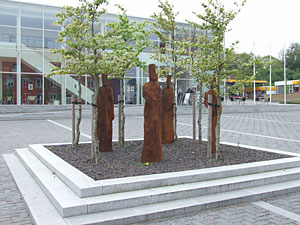 I. Træroden - Rustfrit Stål - Henviser til et omstridt træ på rådhuspladsen, som blev fældet i 1920, trods protester fra bl.a. den kendte herboende forfatter Johannes Buchholtz II. Skovsøen - Svensk diabas og bronze - En fortolkning af begrebet vandkunst. III. Kirkeplanet - Cortensstål - Refererer til grundplanen af Gimsing Kirke, som fungerede i ca. 800 år som Struerområdets kirke. IV. Struermanden - Bronze- Knytter sig til "Struerpigen" (Skulptur i anlæget udført i 1920 af Anker Hoffmann) Krukkerne, som støtter hovedet, er silhuetter af de to krukker, som pigen bærer på. Udført med støtte fra Statens Kunstfond. |