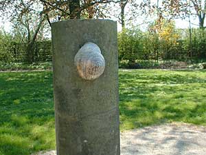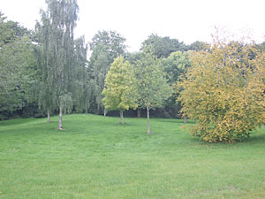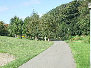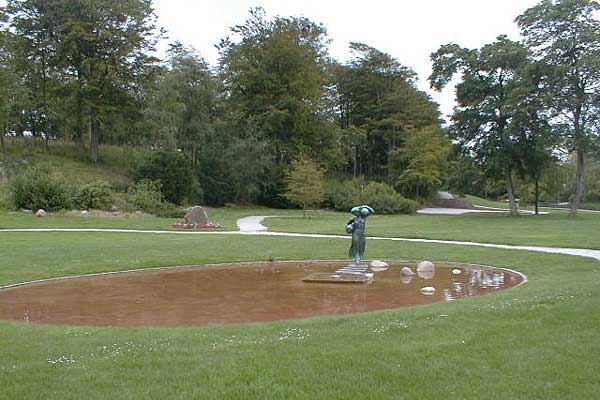 parkanlægget, som vi bruger til hjemturen.. Nedgangen til stierne ligger lige efter skulpturen til venstre og derefter under tunnellen, eller man kan skrå over gaden og tage en gangsti der fører fra Bredgade ned til byens park. "Anlægget". |