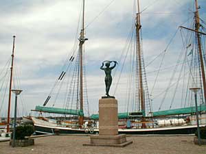 "Sarpsborgpigen" Kåre Orud, Norge opstillet 1948 er en gave fra venskabsbyen Sarpsborg, Sverige og pryder havnen lige ud for det sted hvor skoleskibet er fortøjet. Men på havnepladsen vil man også kunne finde små fine stenskulpturer. |