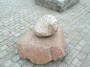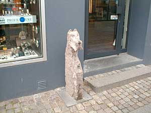 Vi går videre ind i gågaden (Østergade) og kommer forbi en spøjs funktionel stenskulptur ved Profil Optik på Østergade 6 Skulpturen med et hundehoved tjener også som fortøjningsplads for hunde, idet den har en krog hundesnoren på maven. |