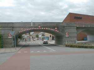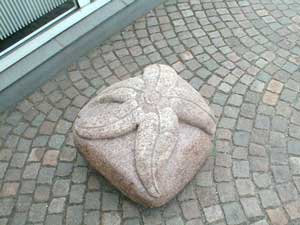op i byen. I et kig gennem viadukten fornemmer man straks en spændende by. Straks man kommer igennem viadukten støder man på den ene ende af byens gågade (Østergade) og et blik op af gaden antyder, at her kan man vist gøre en god handel.... og det kan man så sandelig! Men vent med at tage gågaden, tag i stedet en tur til venstre op mod jernbanestationen. Stenskulpturen "Søstjernen" kan ses uden for hjørneejendommen Østergade 26 |