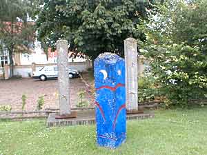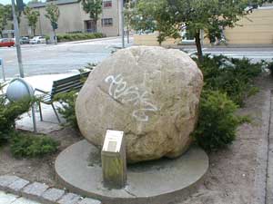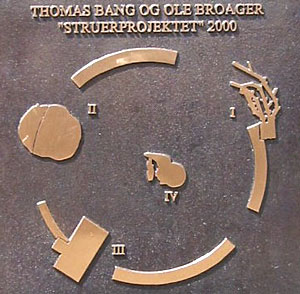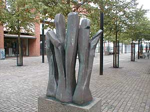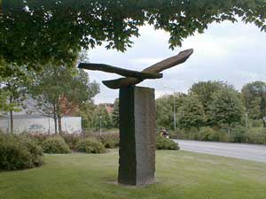 Vel ankommet til stationspladsen går vi nu op af Jyllandsgade for at se et kunstværk af den meget omtalte installationskunstner Ingvar Cronhammar. Kan man ikke komme på hvem denne kunstner er, så tænk på hans store installation ved Herning kunstmuseum "Elia". En metalkugle, der som en anden ufo er styret ned og halvt begravet i jorden med 4 metalsøjler der venter på kontakt fra rummet og vil kunne opfange et lynnedslag og forvandle det til en gigantisk rungen i sit indre. På trods af sine enorme dimensioner står installationen mærkelig udominerende i landskabet, og man stemmes til ro og eftertanke, når man møder dens mærkelige kraft. |