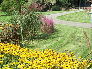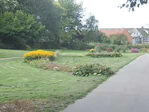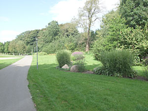 Beplantningen igennem parken er lidt speciel. Man har sat blomsterbedene i slyngninger, så det ligner å-løb. Spændende nytænkning!!!! Til sidst når man frem til anlæggets andedam, som tiltrækker både børn og voksne. Det er tydeligt at ænderne er fortrolige med de passerende og svømmer imod en, i forventning om godbidder. |