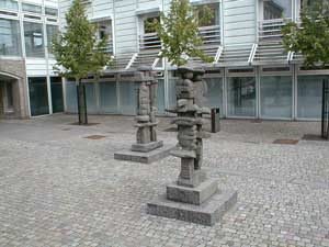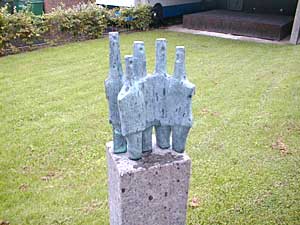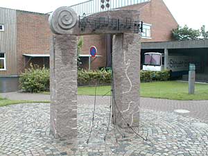 Vi vender om og går tilbage til lyskrydset. Svinger til højre op af Bredgade og lige efter hjørnet af musikskolen går vi ind. Her er der opstillet 2 dejlige skulpturer. Musikkens Portal 2000" af Hans Feldthaus |