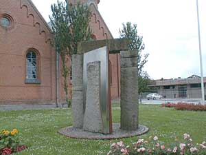 Herefter går vi videre op af Bredgade og svinger til højre op imod Struer Kirke af Kirkebakken, tager trappen helt op til kirken hvor der er opstillet "Skabelsens Port -Lyset og mørket-" Af Henrik Voldmester 1991 |