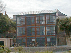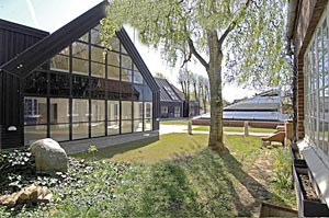 Godt forbi den første lysregulering ved jernbaneoverskæringen, vil man umuligt kunne overse et hus med glas på hele facaden, hvor man kan få et direkte indblik i både husets beboere og indretning. Vi er i tidsalderen med "Big Brother" på TV skærmen og i dette hus har man anvendt en modig arkitektur og de ligeså modige beboere viser tydeligvis gerne deres hjem frem. |