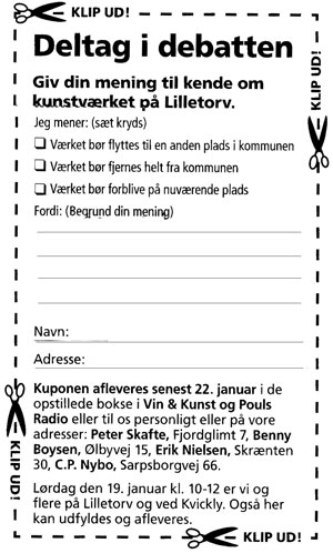 fjernet: Nazityskland indførte "Entartete der Kunst", hvor politiske "smagsdommere" bestemte hvad der var god kunst for folket og hvor de skulle være. Mange kommunistiske lande indførte noget lignende i efterkrigsårene. Vi skal måske til at indføre demokratisk kunstcensur? Hvad borgergruppens mål er, kan være svært at se ud over at de hader dette kunstværk og vil have det erstattet med et Springvand !!? |