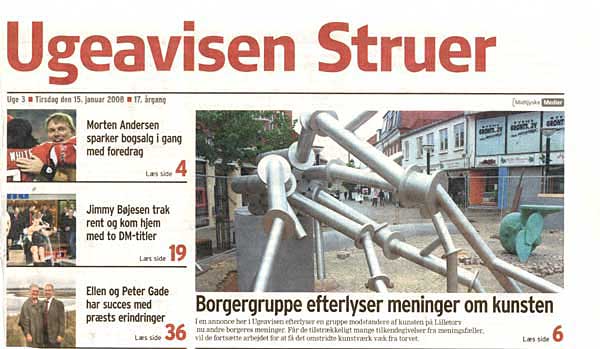 Kulturfjenske smagsdommere!En borgergruppe har utrolig meget imod dette kunstværk og forsøger at sætte en folkestemning op, for at få (det omstridte) kunstværket fjernet eller flyttet. Helst helt væk fra kommunen. Kunstværker er til for at blive set